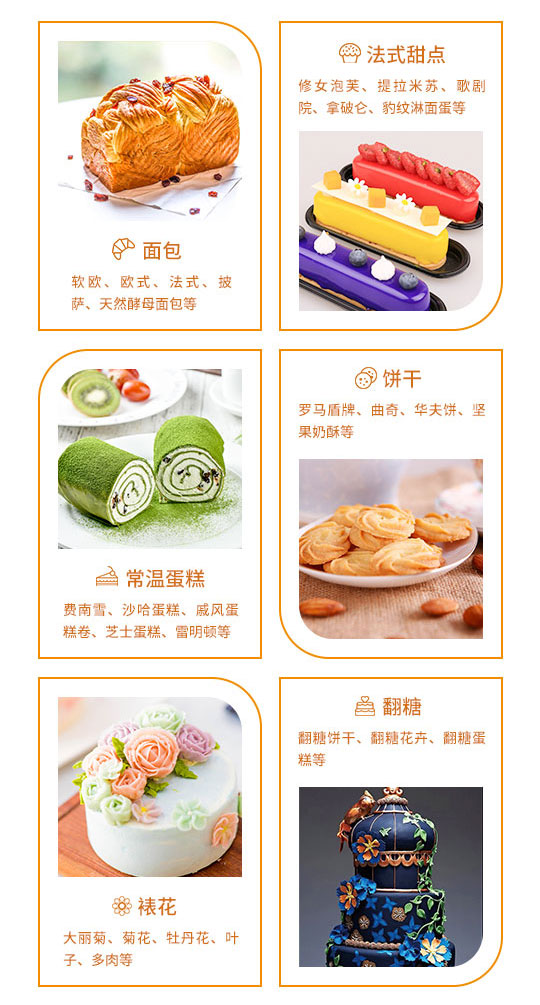 所有课程循环教学(一年内有效),教学品种定期更新,教会你来自十几个国家180余种烘焙产品。
